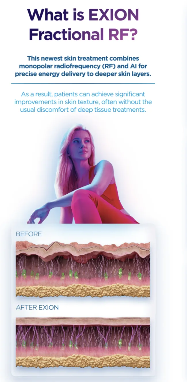 It's the only microneedling system that uses AI + Monopolar RF. Most RF microneedling devices use bipolar energy, which only treats the surface layers of the skin. Exion’s monopolar radiofrequency allows it to penetrate deeper — and its